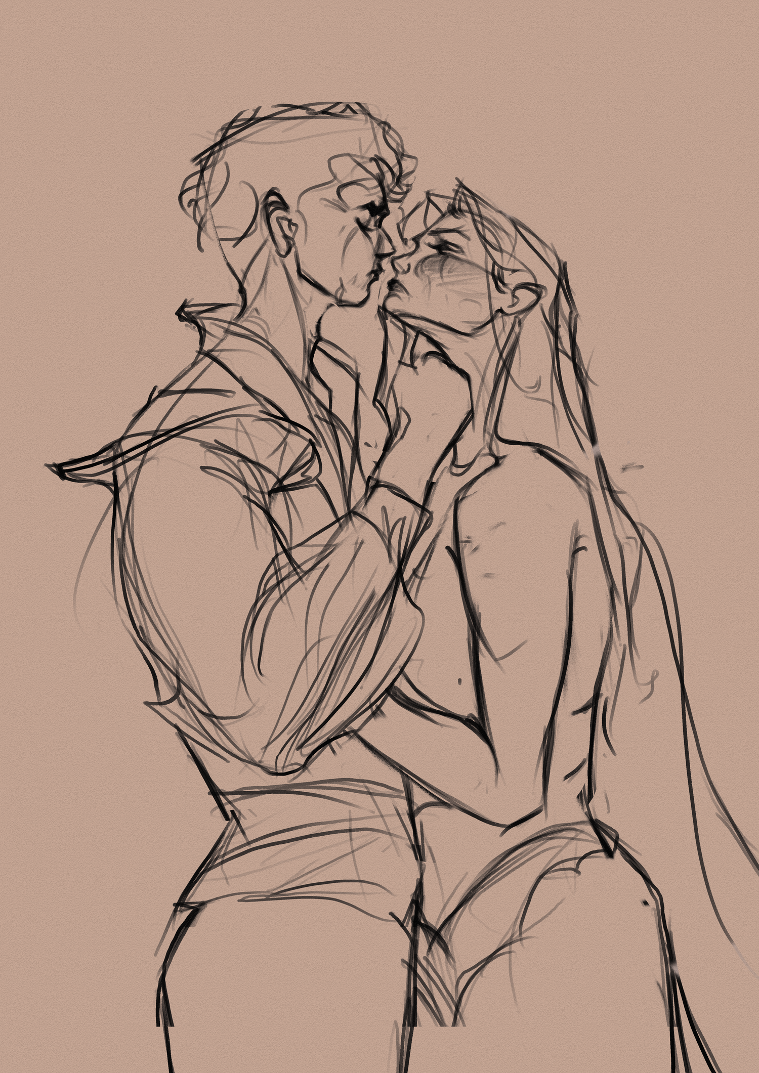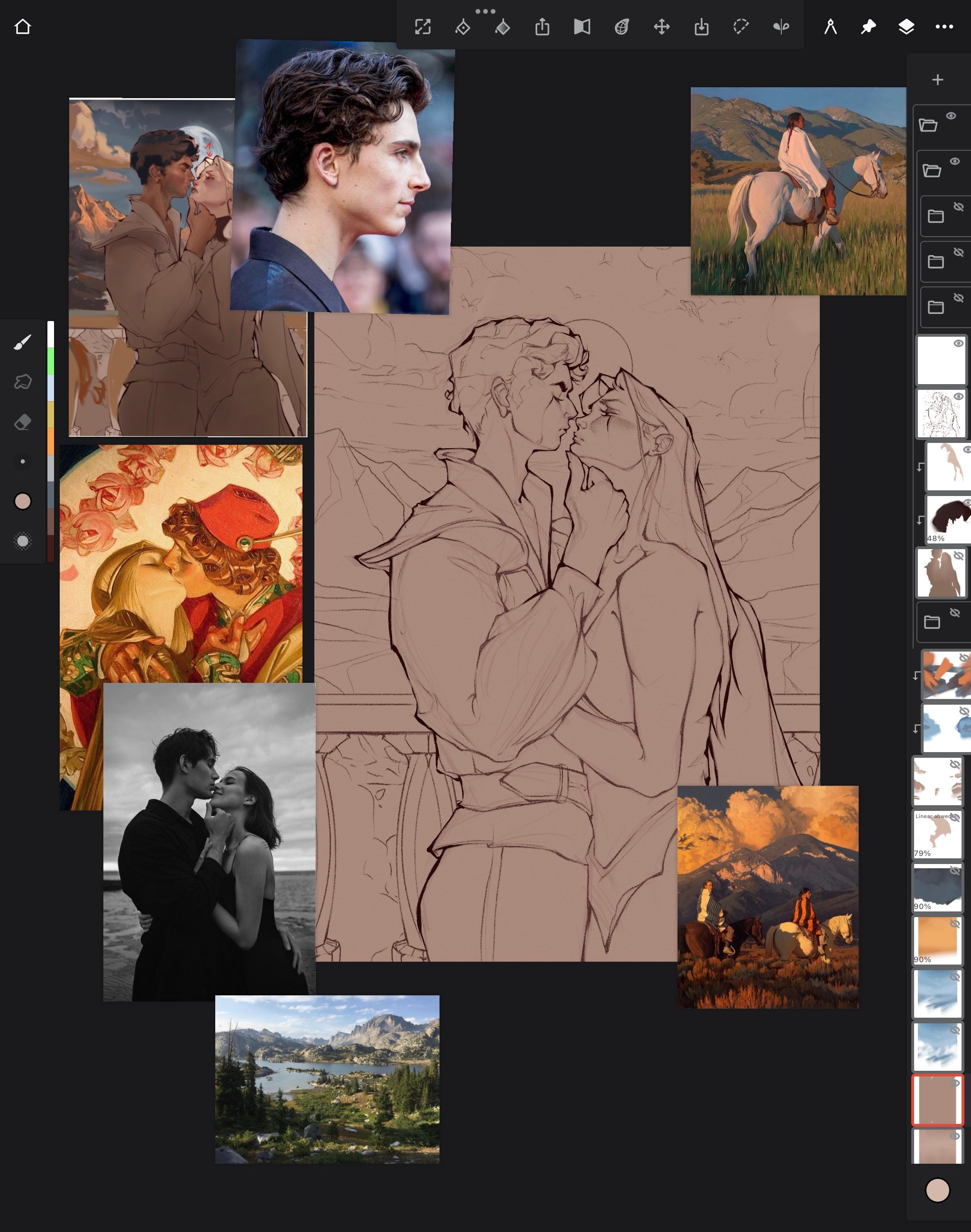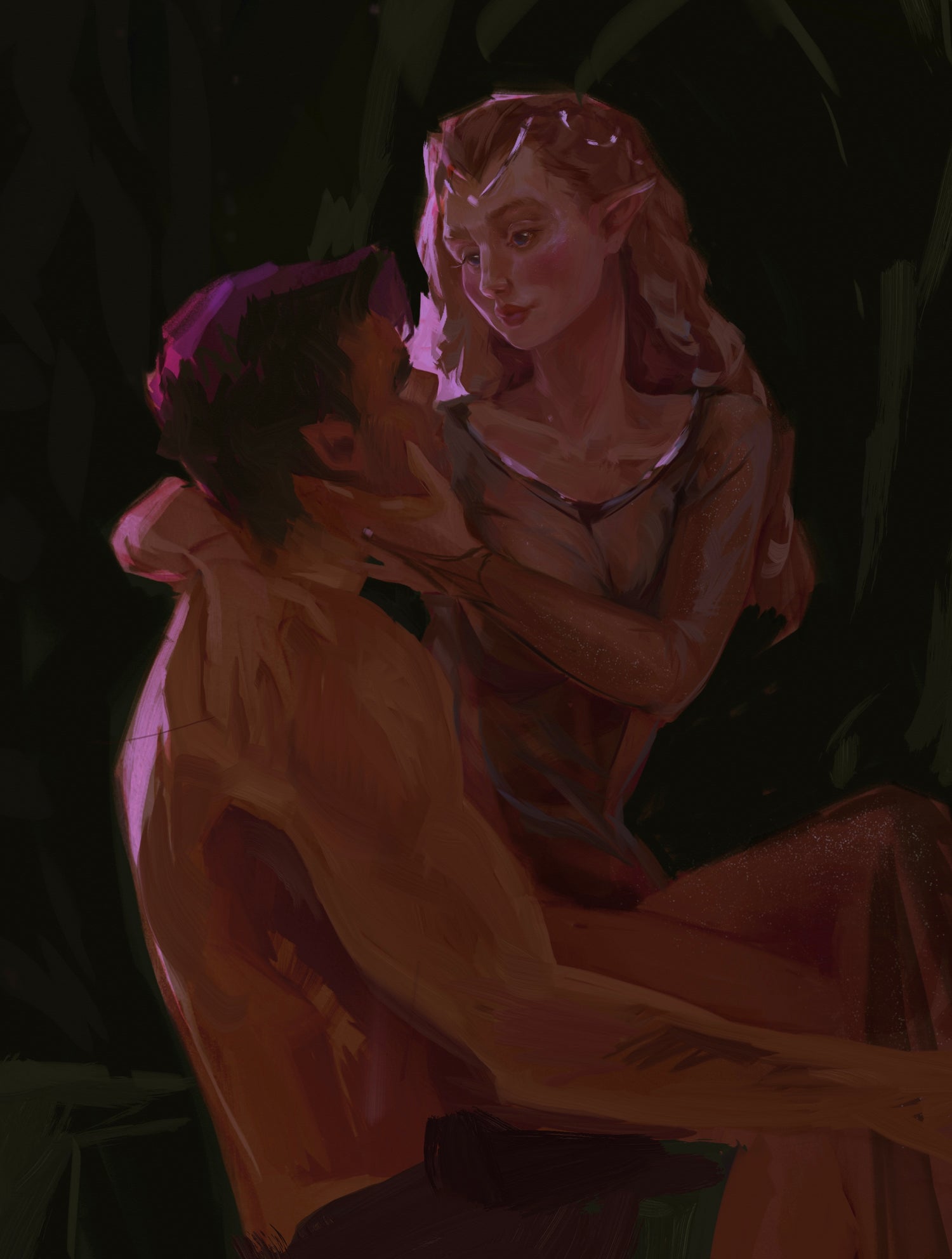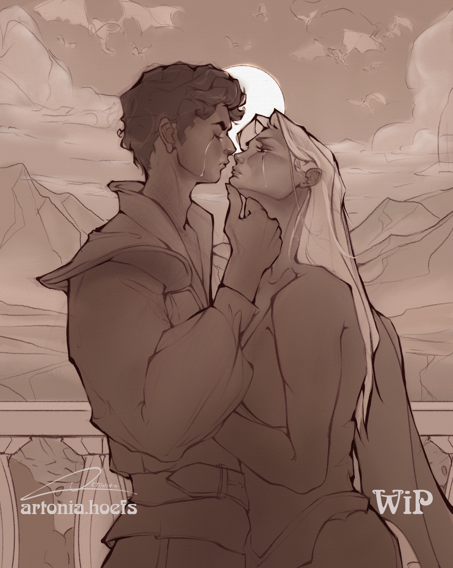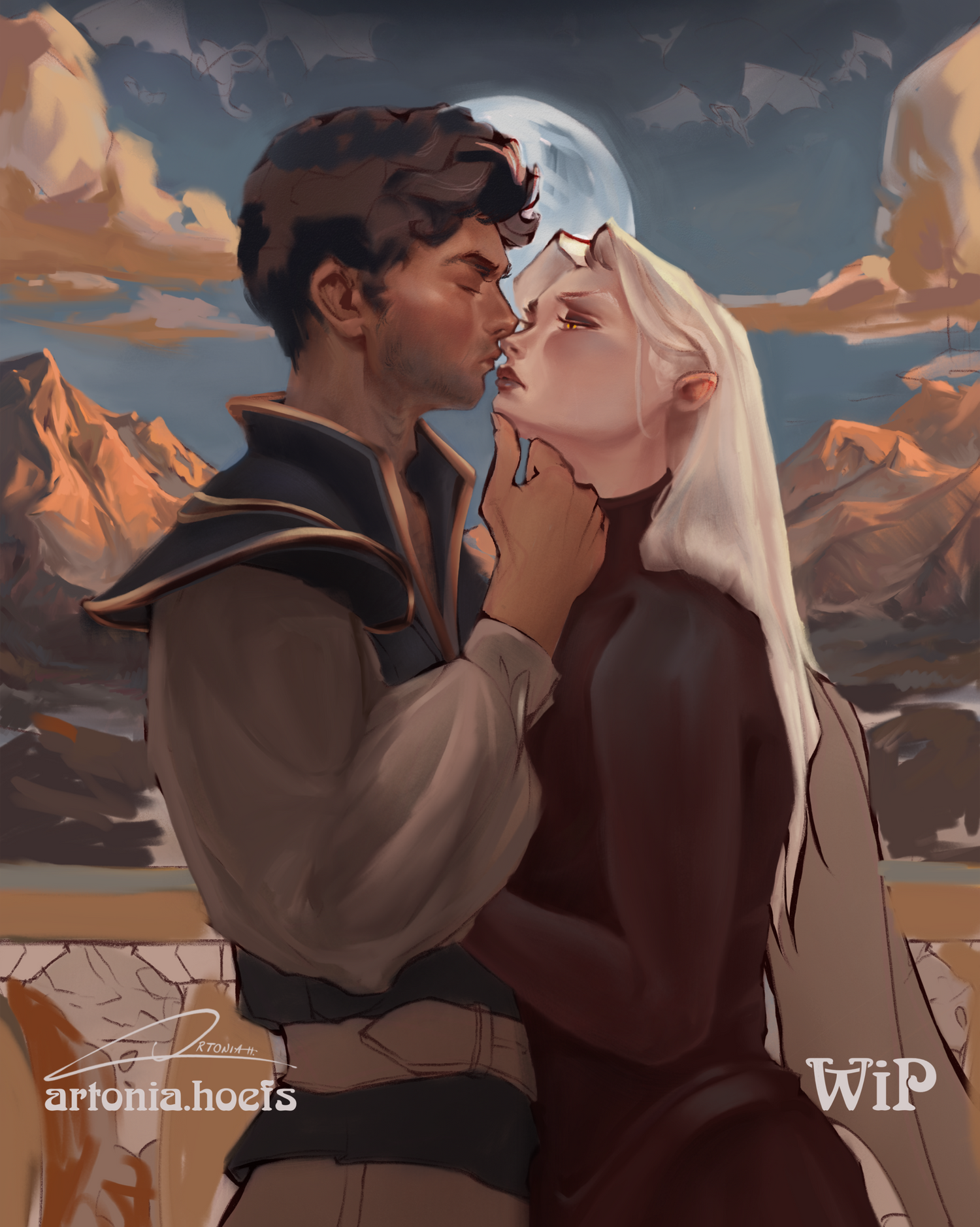 I’m currently focused on finishing the painting of Feyre and Rhysand. Over the past few months, I’ve developed a new style that leans more into loose, expressive brushstrokes. Before, I primarily worked with a soft, fuzzy brush, but this new approach gives the painting a more dynamic feel without looking too washed out.
